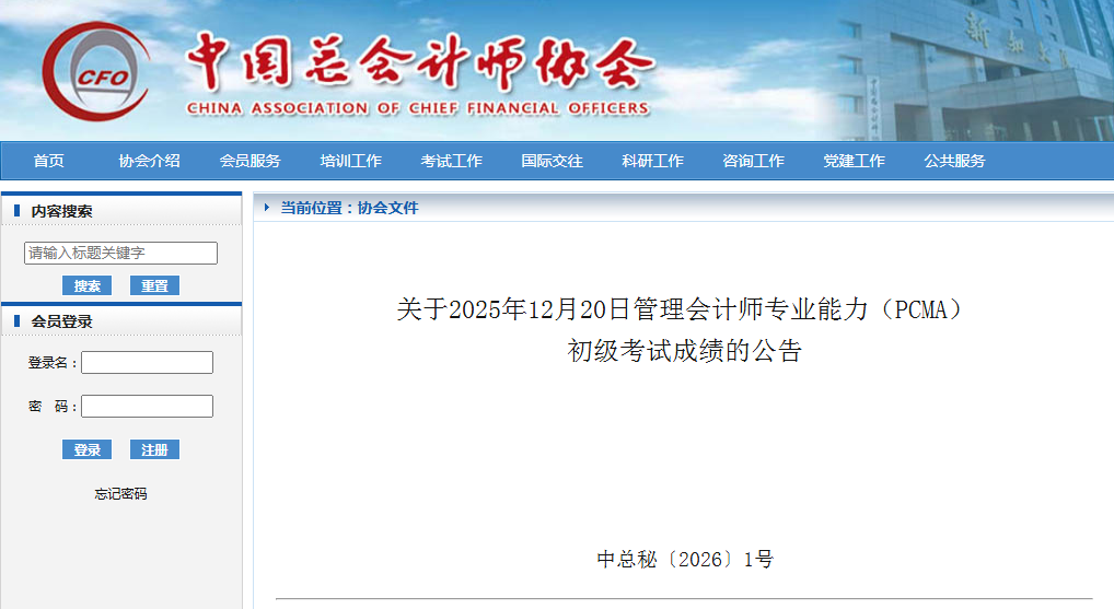 根据管理会计师专业能力(PCMA)初级考试等有关规定,现将2025年12月20日管理会计师专业能力(PCMA)初级考试成绩在中国总会计师协会(以下简称中总协)官网(www.cacfo.com)公布。相关事项公告如下: